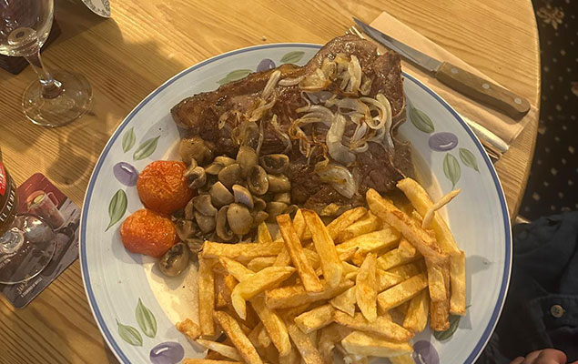 21-day matured beef steak with homemade hand cut chips, fried onions, mushrooms, grilled tomato or side salad.